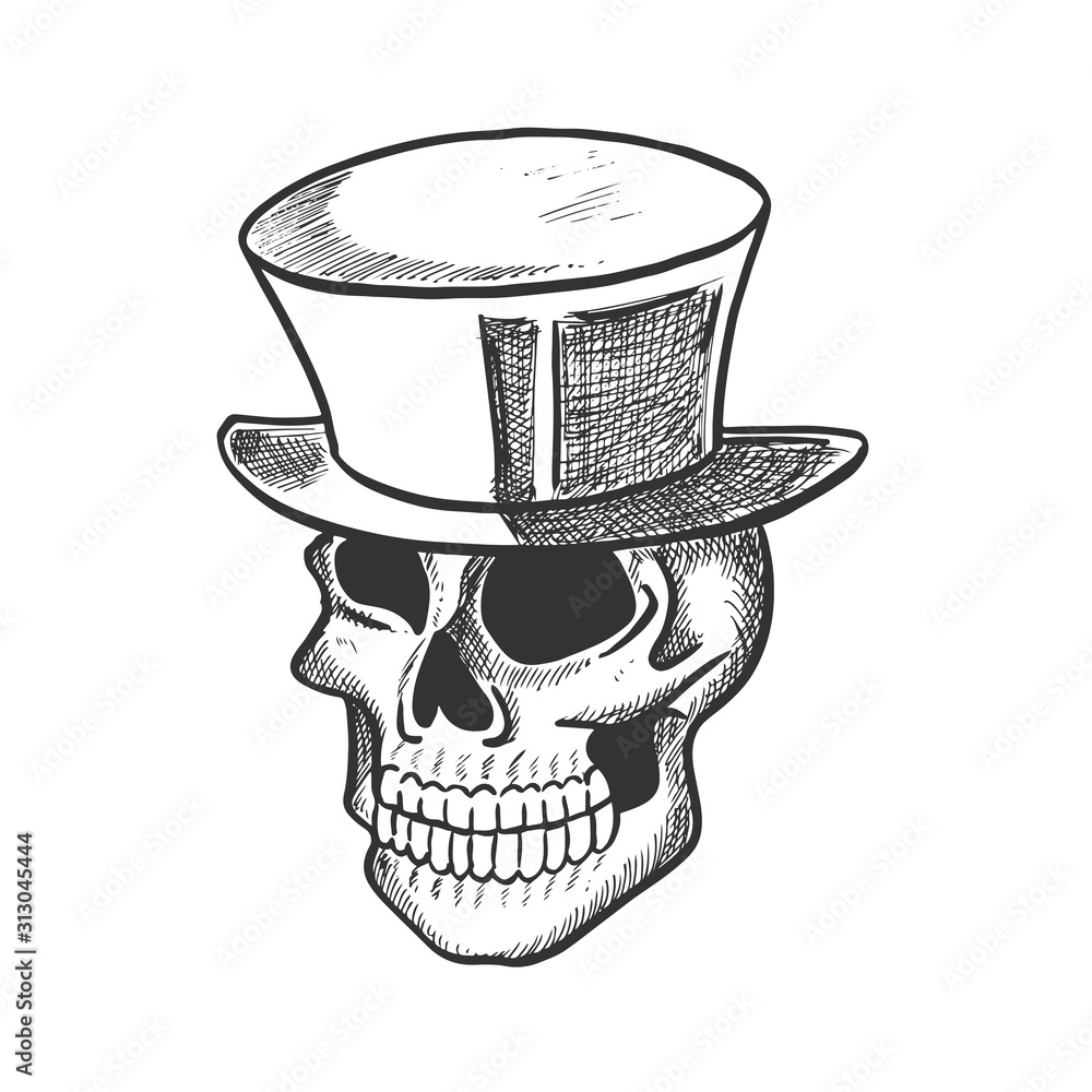 Skull In Vintage Top Hat Sketch For Halloween Holiday Celebration Design Skeleton Head Of Dead Human Evil Monster And Horror Zombie Wearing Hat For Tattoo Design Stock Vector Adobe Stock